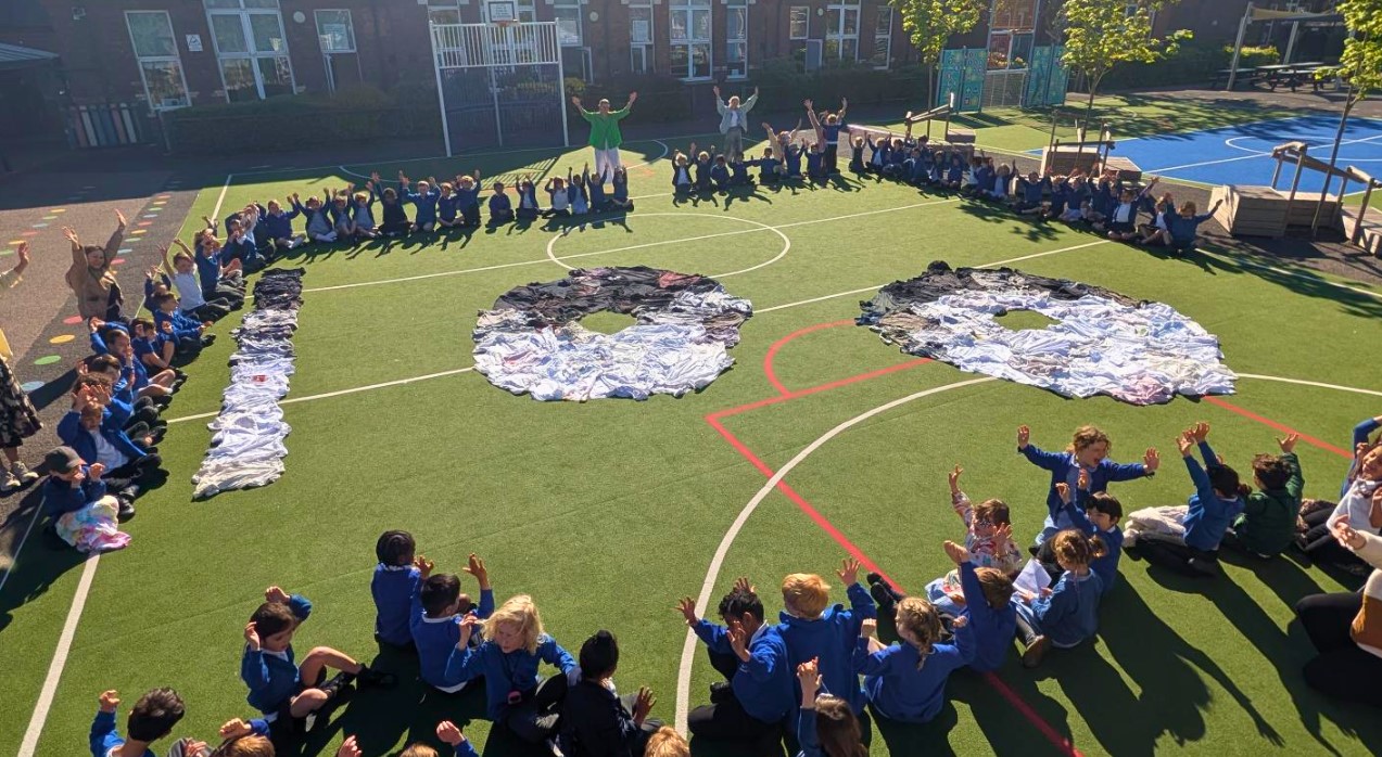 We celebrated Earth Day 2026 & Sir David Attenborough’s 100th birthday with a spectacular Art Attack-style project! Every year group joined forces on the playground to create a massive mural using over 500 recycled t-shirts. By repurposing old clothing into a giant image of the Earth, we hope to have highlighted the importance of sustainable fashion and waste reduction. All of the t-shirts will be re-used in school as art t-shirts to cover the children’s uniform and allow us to get even more creative in our art lessons. Thank you for your support in sending in your old t-shirts!